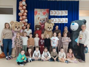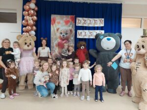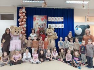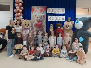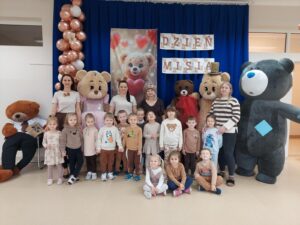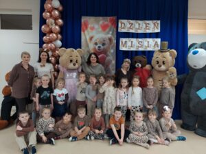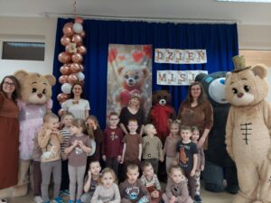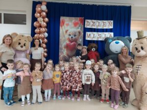 Tego dnia w przedszkolnych salach zapanowała wyjątkowo radosna atmosfera, wszędzie można było spotkać pluszowych przyjaciół oraz… cztery duże misie. Przedszkolaki bawiły się wspólnie z misiami przy skocznej muzyce. Był wesoły pociąg, który sunął przez całą salę, skoki przez kolorowe hula hop, a także tańce w kole. Nie zabrakło również ulubionych przez dzieci piosenek z pokazywaniem, podczas których maluchy mogły wykazać się energią, wyobraźnią i poczuciem rytmu.