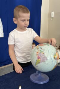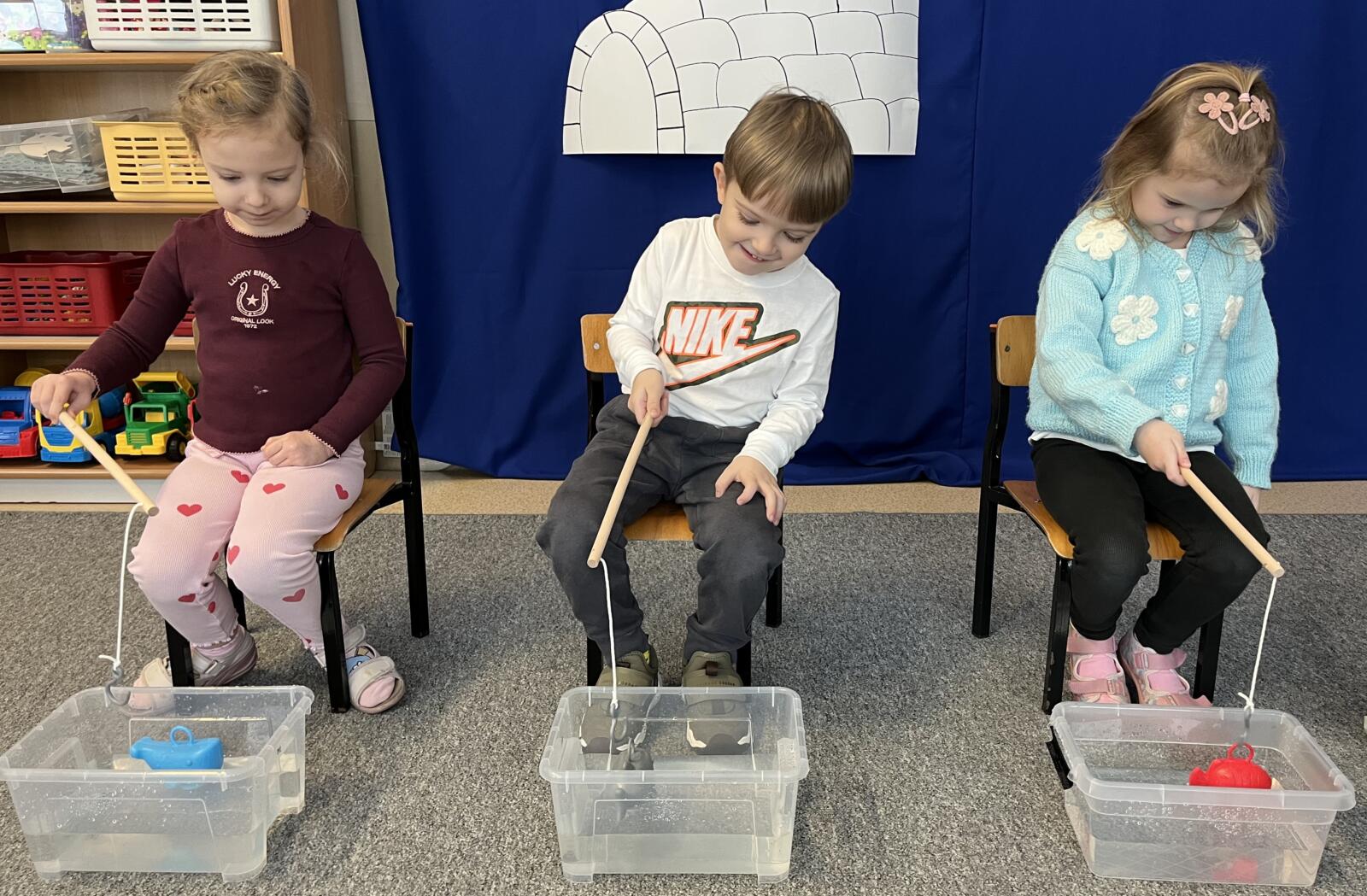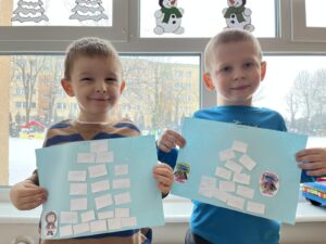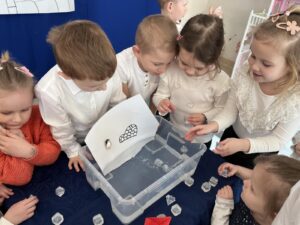 Panterki wyruszyły w niezwykłą podróż do lodowej krainy Arktyki i Antarktydy. Dzieci dowiedziały się kim są Eskimosi, czym jest igloo oraz jakie zwierzęta żyją w tych mroźnych rejonach świata. Poznały globus i z jego pomocą odnajdowały miejsce zamieszkania pingwinów. Wykonały pracę plastyczną – igloo, doskonaląc sprawność manualną i koordynację wzrokowo-ruchową. Podczas zabawy w łowienie rybek ćwiczyły koncentrację, cierpliwość i precyzję ruchów. Na zakończenie, poprzez doświadczenie, samodzielnie stworzyły własną lodową krainę, rozwijając ciekawość poznawczą i kreatywność.