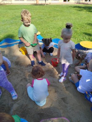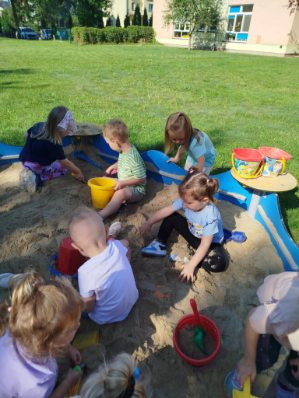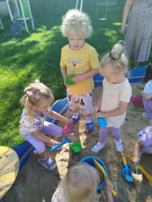 Nie zabrakło również zabaw na świeżym powietrzu. Plac przedszkolny tętnił śmiechem, gdy „Biedronki” bawiły się, budowały zamki z piasku i wspólnie odkrywały świat wokół siebie. Te chwile pozwoliły dzieciom nawiązać pierwsze przyjaźnie i poczuć się częścią przedszkolnej społeczności.