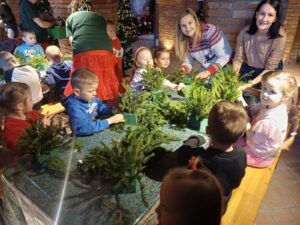 Najpierw przedszkolakiwzięły udział w warsztatach plastycznych, podczas których własnoręcznie wykonywały porcelanowe bombki. Następnie dzieci stworzyły stroiki świąteczne, wykorzystując gałązki, wstążki i pachnące ozdoby. Dzieci pracowały z ogromnym zaangażowaniem, a ich prace zachwycały pomysłowością.