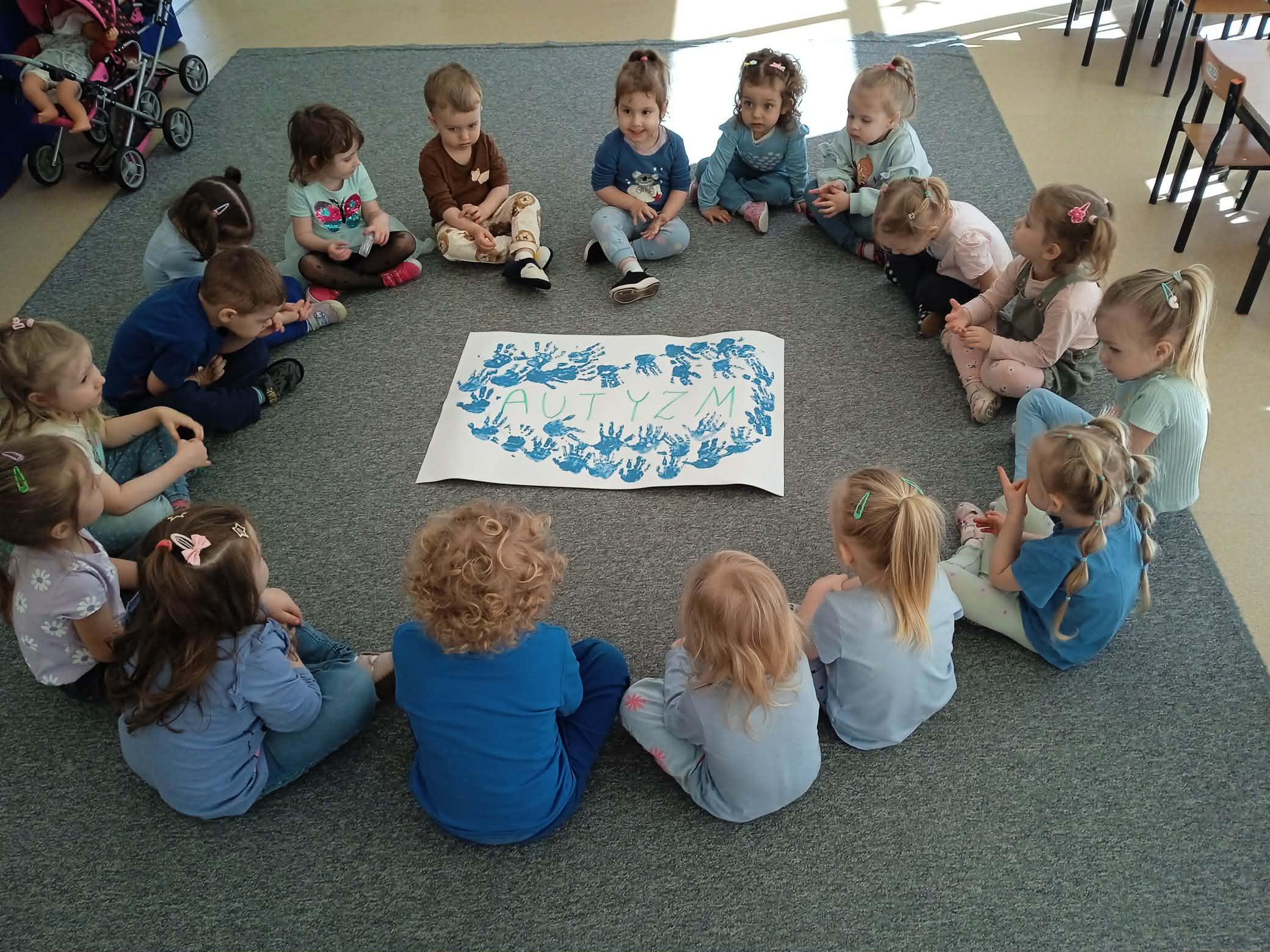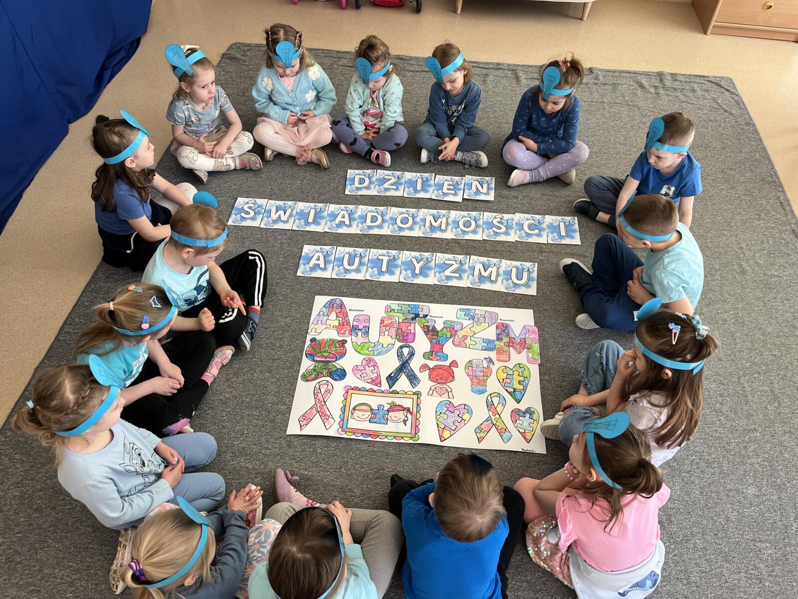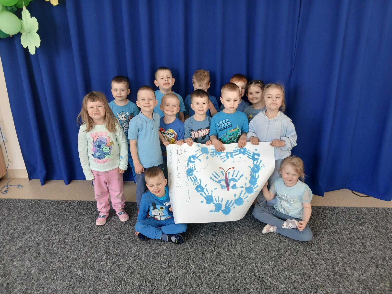 Grupa Wróbelki ubrana na niebiesko prezentuje przygotowany plakat będący wyrazem solidarności z osobami z autyzmem