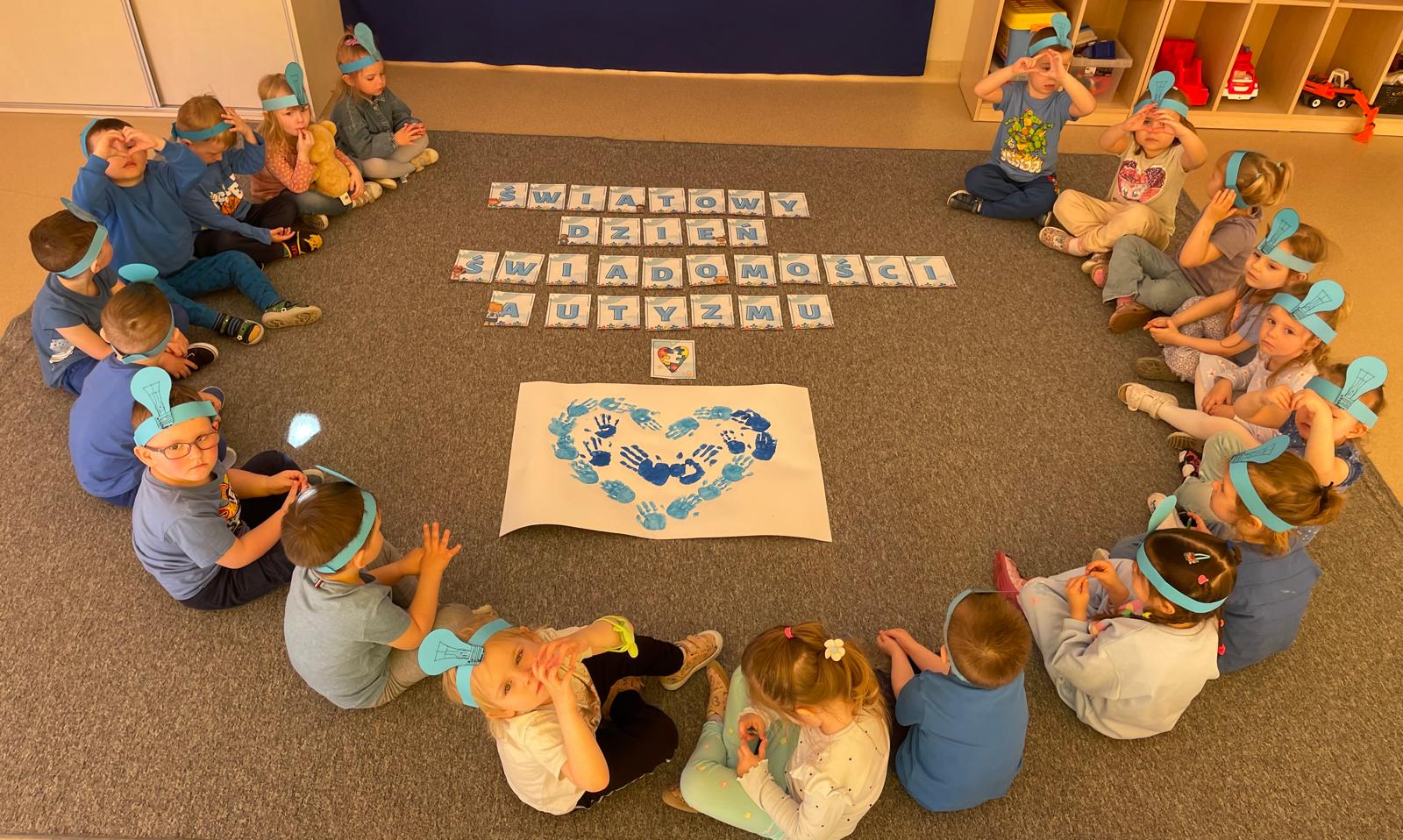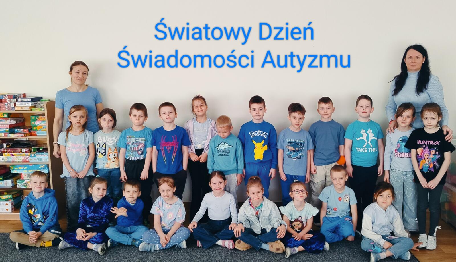 Grupa Delfinki ubrana na niebiesko prezentuje napis “Dzień Świadomości Autyzmu” będący wyrazem solidarności z osobami z autyzmem