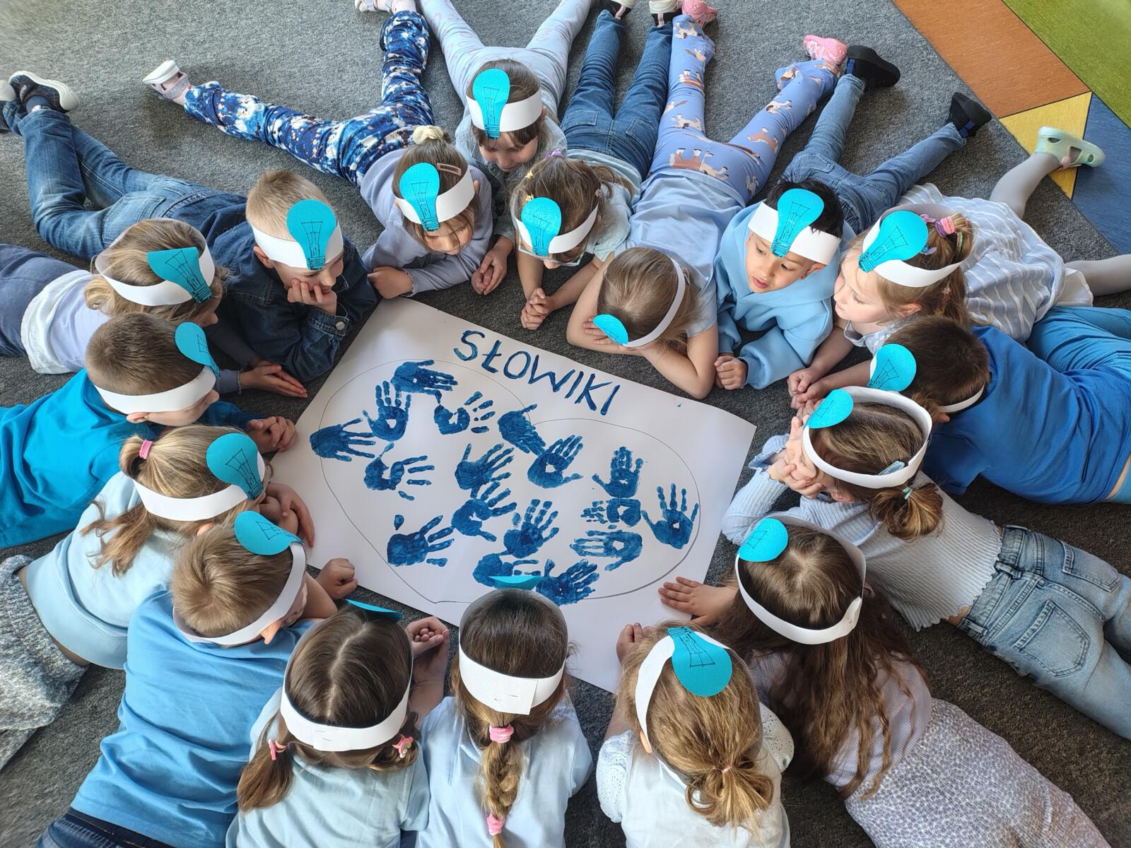 Grupa Słoneczka ubrana na niebiesko prezentuje przygotowany plakat będący wyrazem solidarności z osobami z autyzmem
