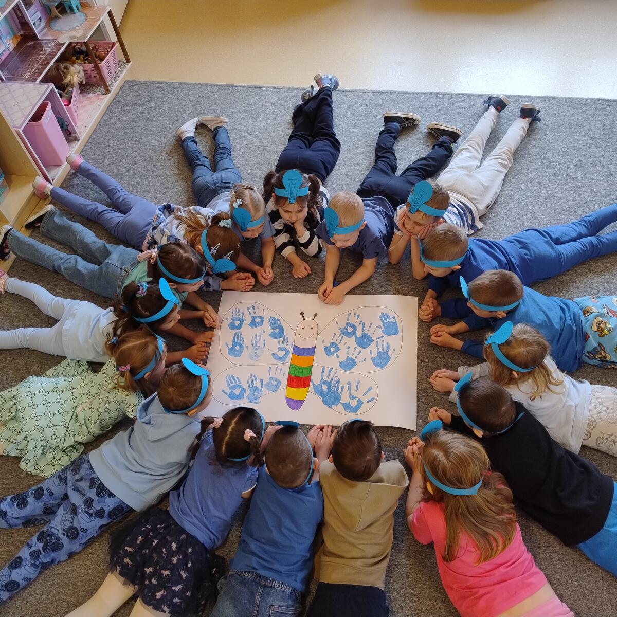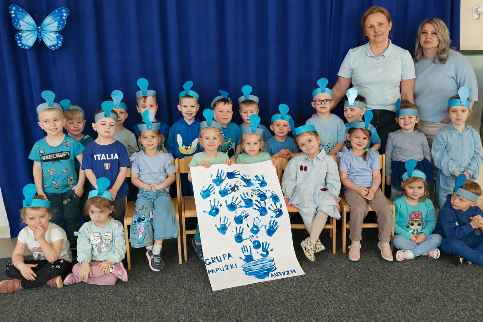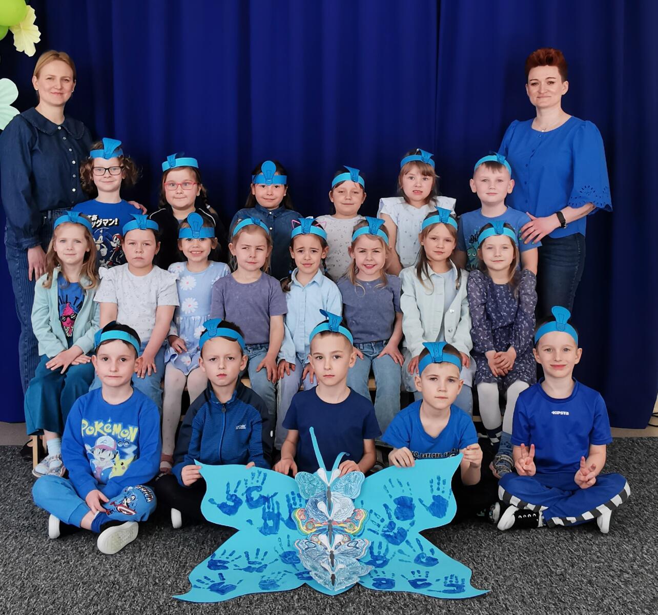 Grupa Motylki ubrana na niebiesko prezentuje przygotowanego z papieru motyla będącego wyrazem solidarności z osobami z autyzmem