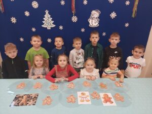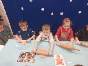 Następnie dzieci uczestniczyły w zabawie sensorycznej z pachnącą świętami masą plastyczną, którą samodzielnie sporządziły. Podczas aktywności lepienia świątecznych cudów, stworzyły figurkę „ciasteczkowego ludzika”. Zmysłowy zapach masy sprawił, że praca stała się jeszcze bardziej magiczna.