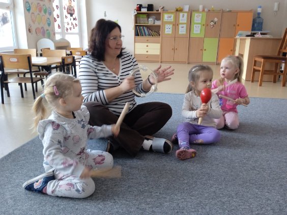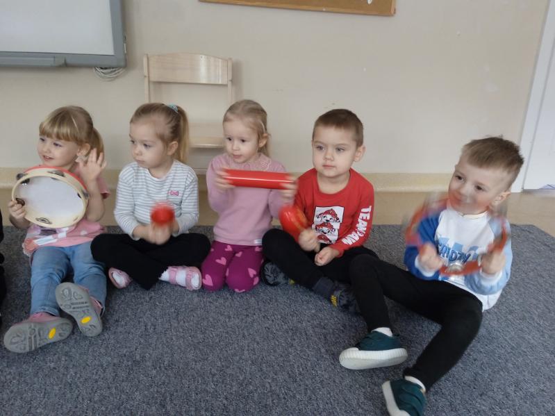 Nie zabrakło również zabaw muzycznych. Dzieci grały na instrumentach perkusyjnych, akompaniując do piosenki „To ja”. Zabawy z instrumentami sprawiły wszystkim wiele radości, rozwijały poczucie rytmu oraz wrażliwość muzyczną.