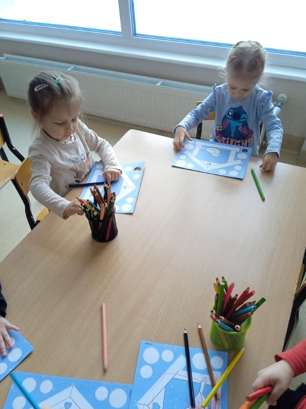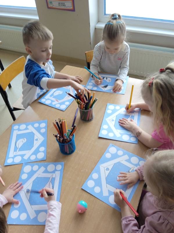 Podczas zajęć plastycznych dzieci wykonały pracę pt. „Ptaszek w karmniku”. Rozmawialiśmy o tym, jak dbać o ptaki zimą i dlaczego potrzebują one naszej pomocy. Przedszkolaki dowiedziały się, czym można dokarmiać ptaki i jak ważne jest regularne uzupełnianie karmników.