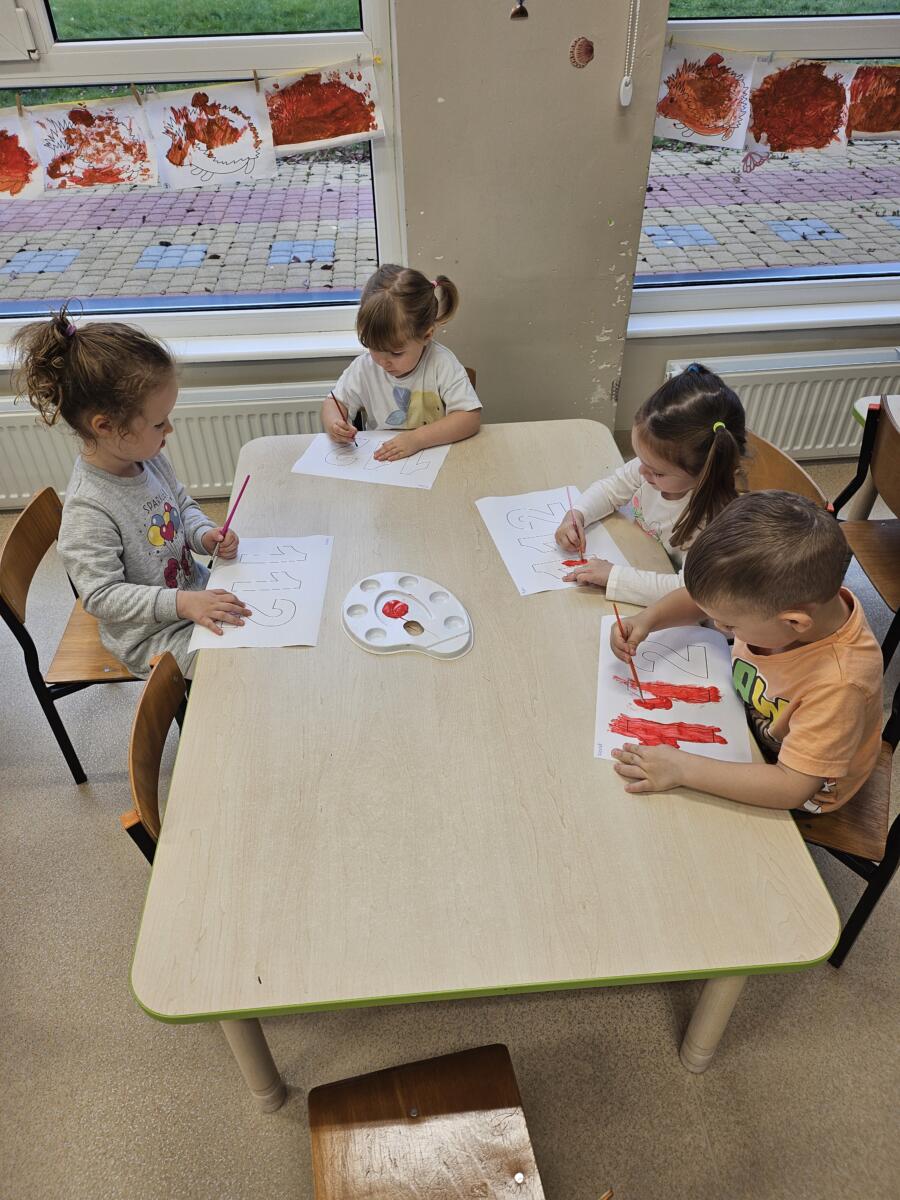 Zdjecia ukazuje dzieci siedzące przy stoliku. Malują one numer alarmowy czerwoną farbą.