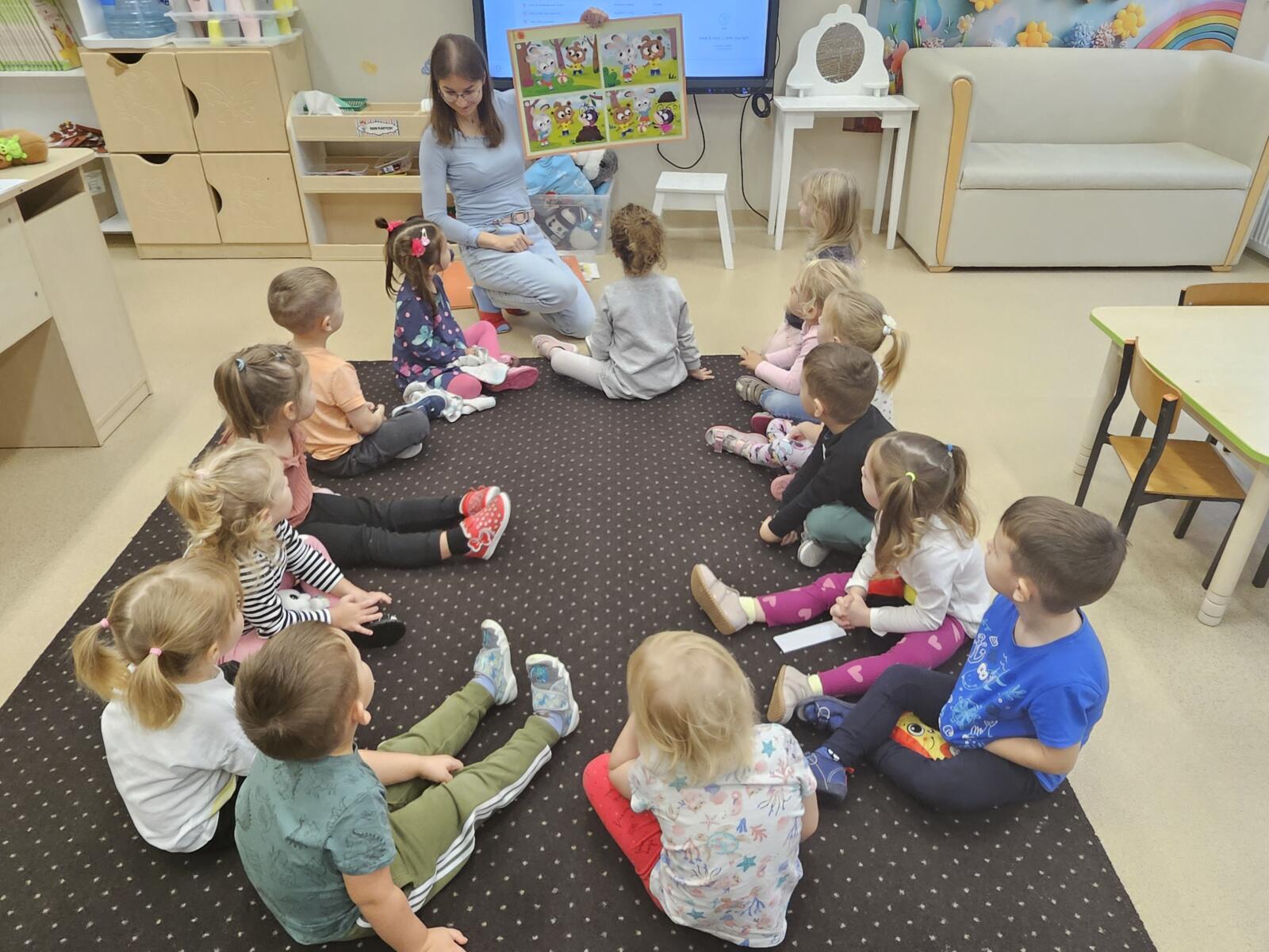 Zdjecoe ukazuje panią i dzieci siedzące w kole na dywanie. Pani trzyma w ręku duży plakat z histeoultjka obrazkową. Dziexi patrza na plakat o słuchają aktywnie historyjki.