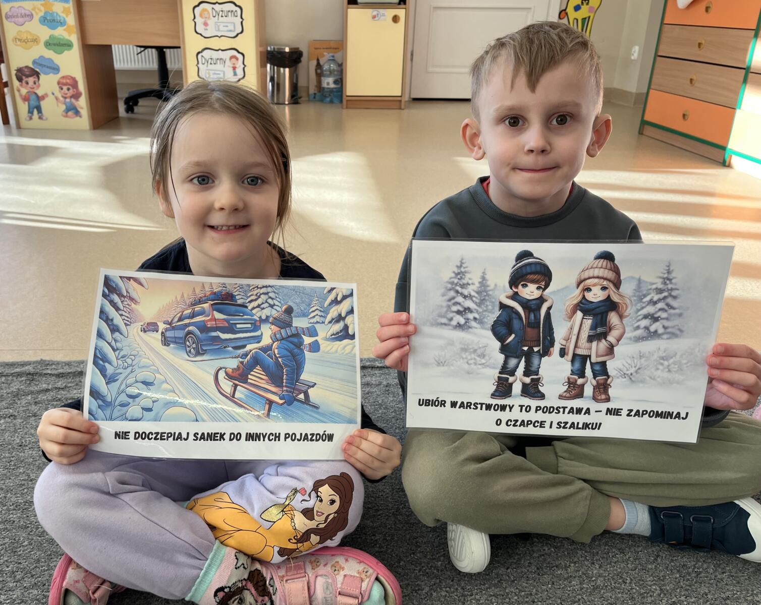 Chłopiec i dziewczynka trzymają w ręku plansze na temat bezpiecznych zabaw zimą.