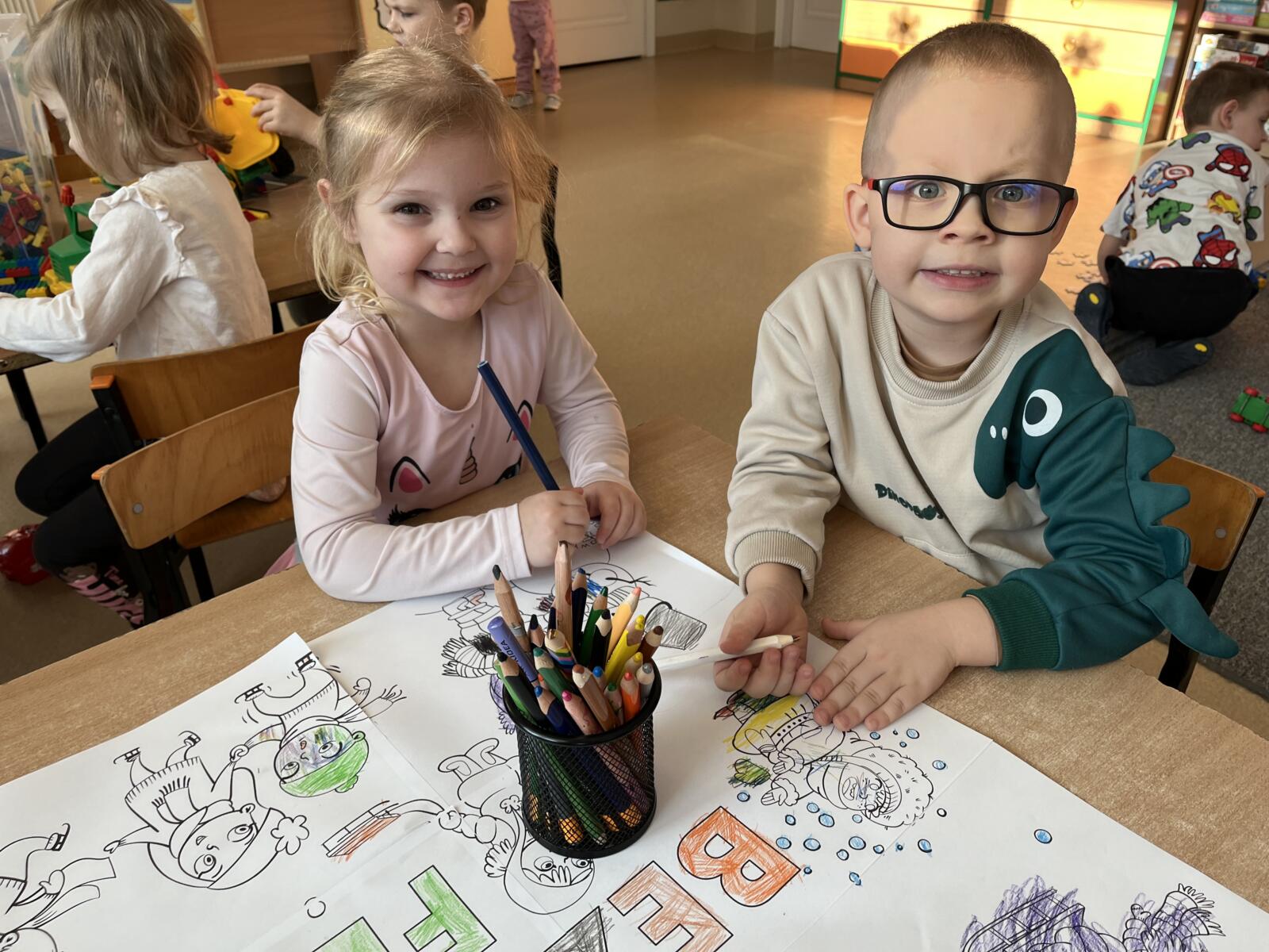 Chłopiec z dziewczynką siedzą przy stole i malują kolorowankę o bezpiecznych zabawach zimą.