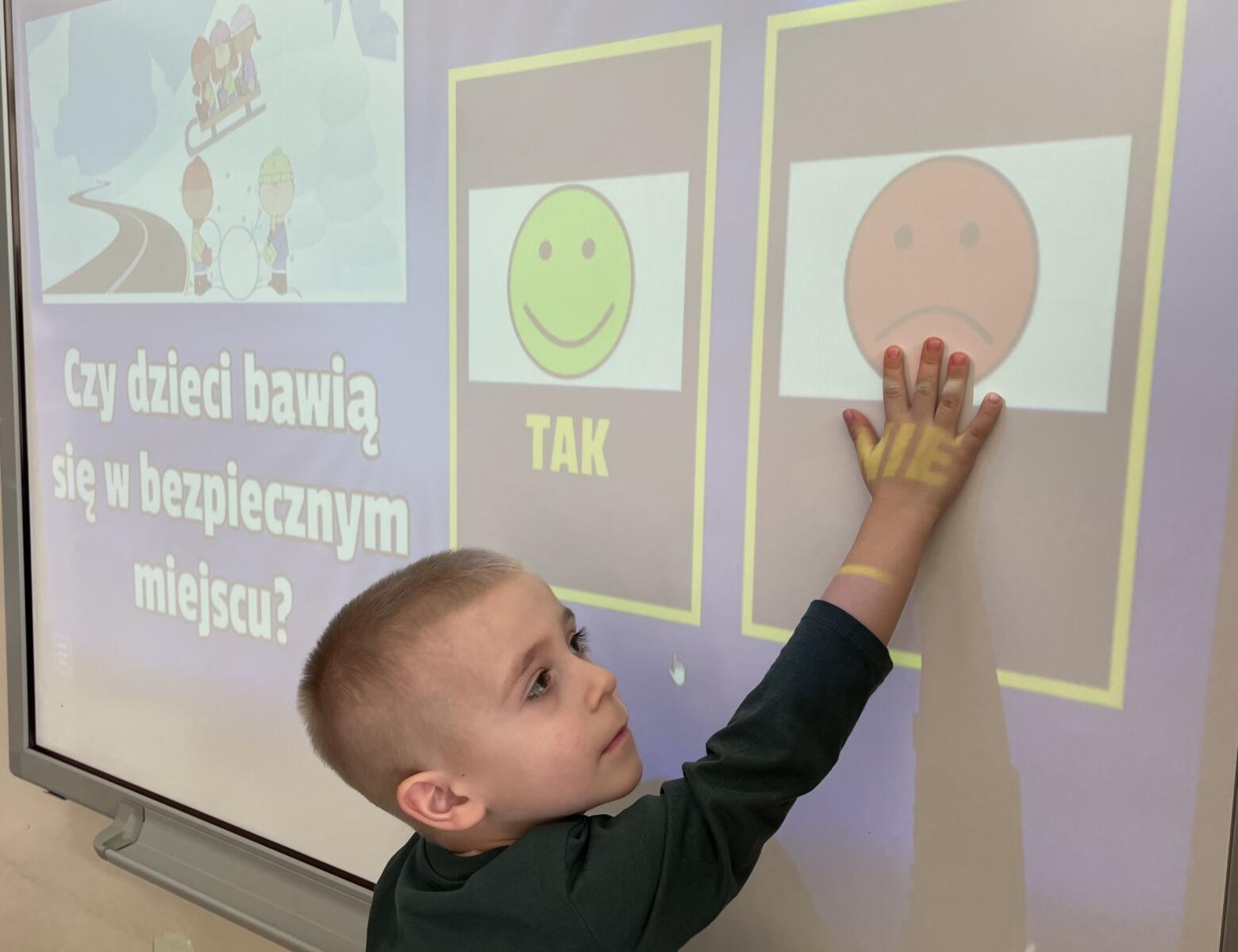 Chłopiec przy tablicy multimedialnej rozwiązuje quiz na temat bezpiecznych zabaw zimą.