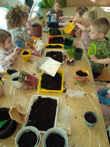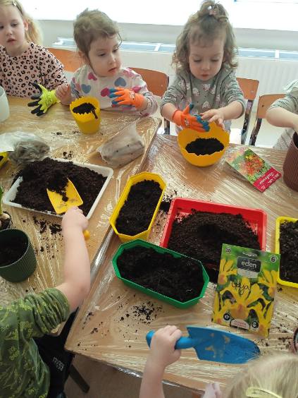 Dzieci z grupy Biedronki z wielkim zaangażowaniem sadziły rośliny. Przedszkolaki poznawały, czego potrzebują kwiaty i inne rośliny, aby zdrowo rosnąć. Każde dziecko mogło samodzielnie nasypać ziemię do doniczki, posadzić roślinkę i podlać ją wodą.
