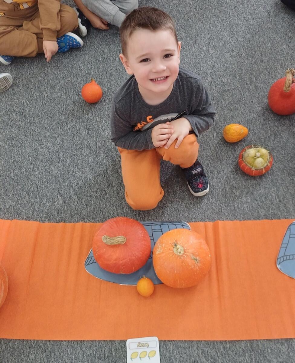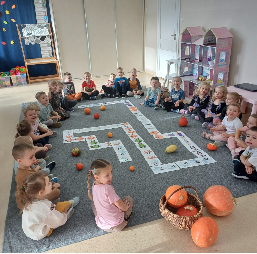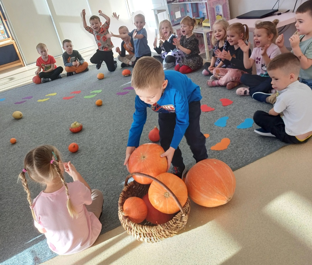W grupie Papużki obchodziliśmy wspaniałe jesienne, tego dnia królowała u nas pomarańczowa bohaterka – duża, okrągła i pełna niespodzianek Dynia .vNa początku dzieci uważnie przyjrzały się dyni – poznały jej kształt, kolor, miąższ i pestki. Z zainteresowaniem obserwowały, co kryje się w środku, i wspólnie zastanawiały się, do czego można ją wykorzystać. Nie zabrakło też dyniowych zabaw edukacyjnych. Dzieci grały w „dyniowe domino”, przeliczały dynie i porównywaly jej wielkości. Dzięki temu utrwaliły sobie pojęcia matematyczne w radosny i aktywny sposób. Odbyła się ruchowa gra „Przenieś dynię”, w której Papużki przenosiły dynie ze startu do mety, starając się jak najszybciej i najostrożniej dostarczyć je do koszyka. Śmiechu i emocji było co niemiara! Dzień Dyni przyniósł wszystkim Papużkom mnóstwo radości, nowych doświadczeń i jesiennej energii. To był naprawdę udany, dzień!