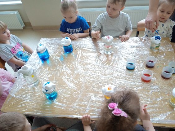 W grupie Biedronki dzieci miały okazję uczestniczyć w ciekawym eksperymencie pod nazwą „Kolorowy deszcz”. Celem zajęć było rozbudzenie ciekawości poznawczej oraz pokazanie w prosty sposób, jak powstaje deszcz.