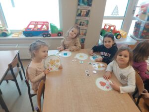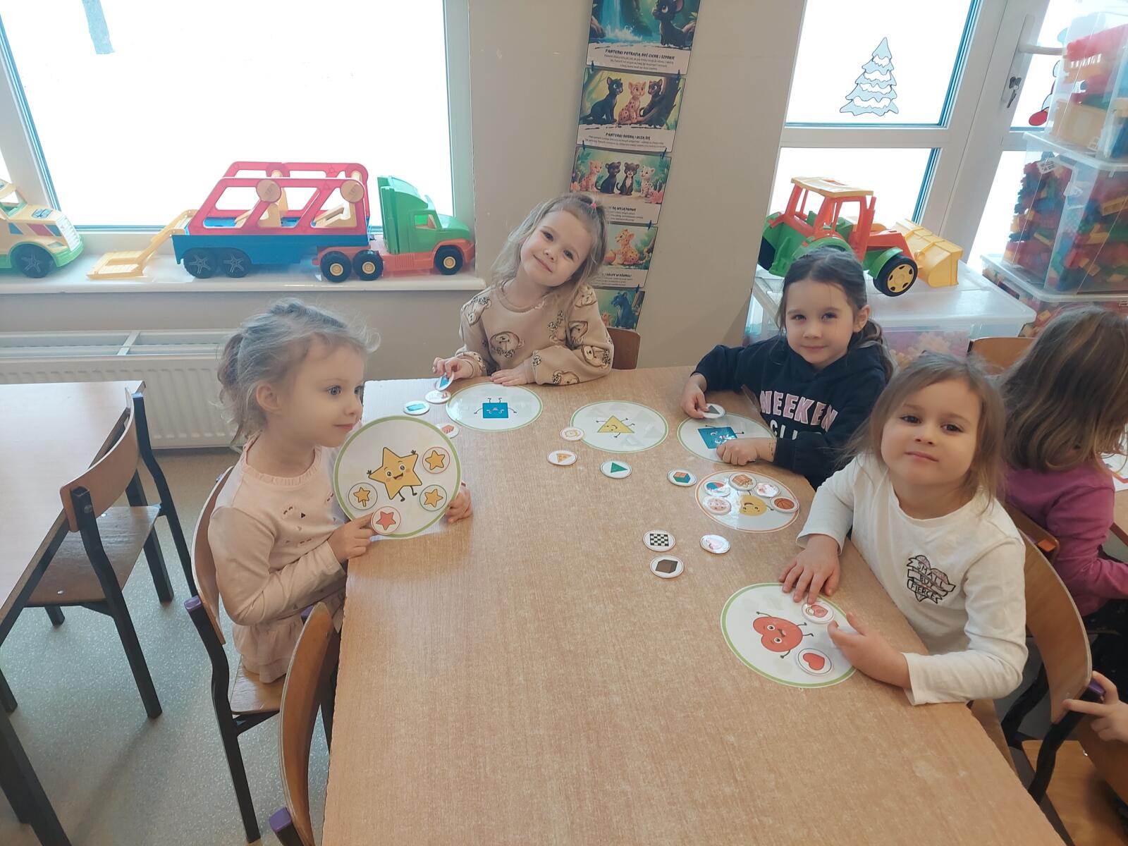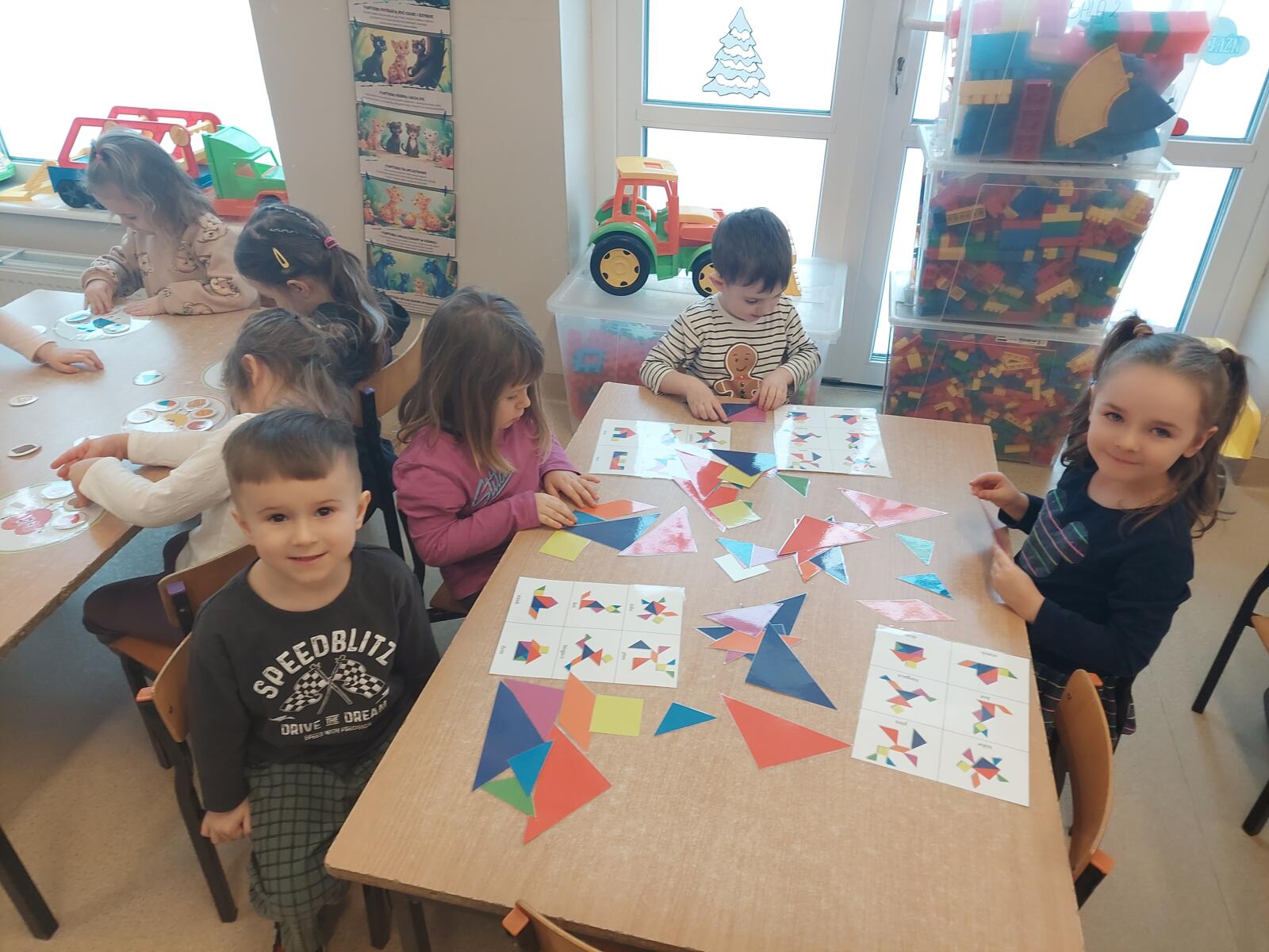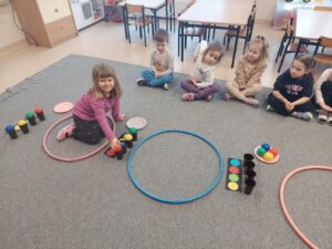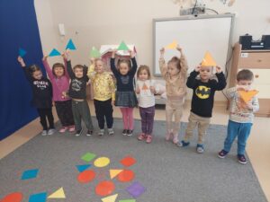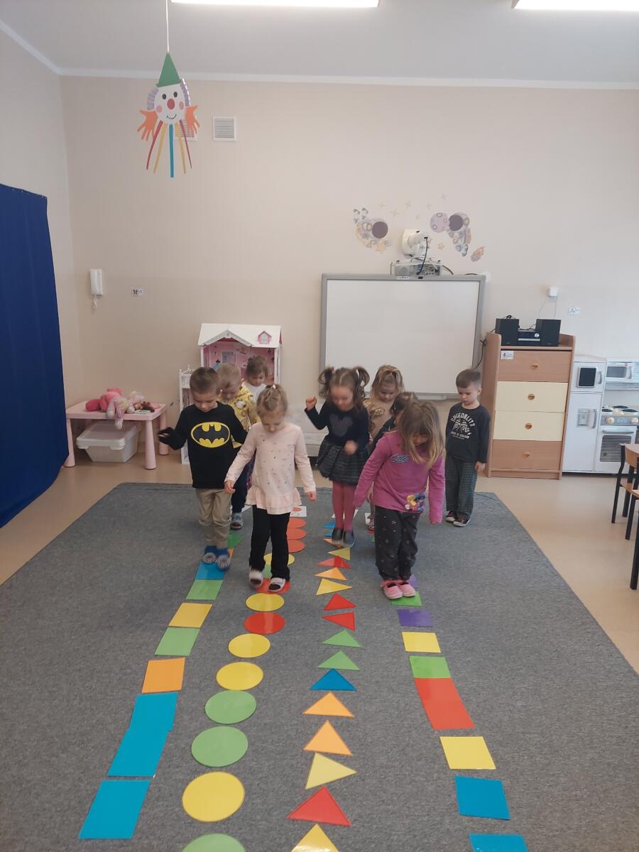 Podczas zajęć przedszkolaki wybierały odpowiednie figury geometryczne, rozpoznawały je po kształcie i kolorze, a następnie klasyfikowały według określonych cech. Zabawy polegały m.in. na bieganiu do wskazanych figur, układaniu ich w zbiory, a także tworzeniu prostych kompozycji z kształtów. Dzięki elementom ruchowym dzieci rozwijały koordynację, refleks oraz orientację w przestrzeni.