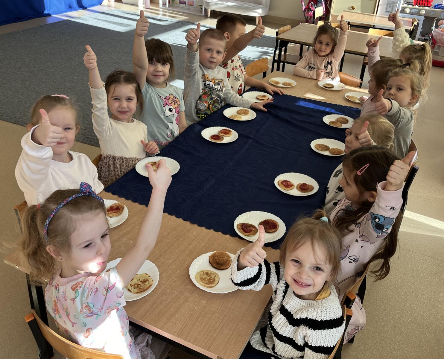 Grupa dzieci siedzi przy stole, na talerzach mają naleśniki, wszyscy podnoszą ręce z kciukiem do góry.