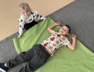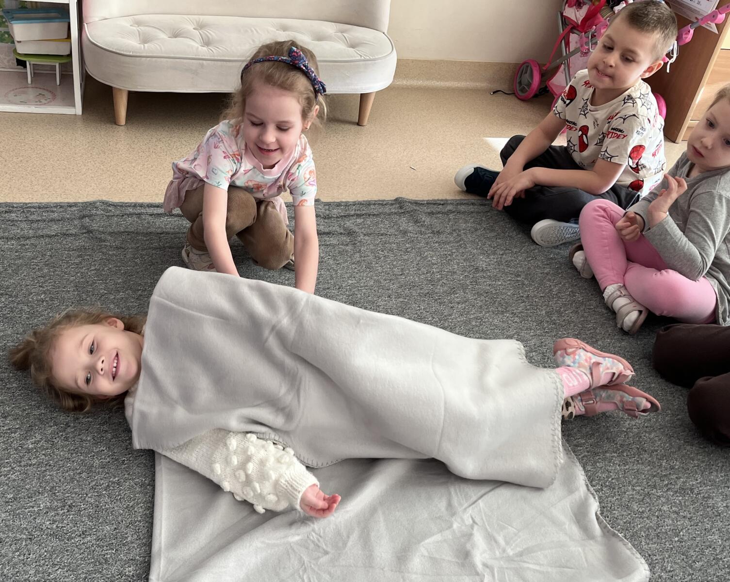 Dziewczynka zawija chłopca w koc “jak naleśnik”.