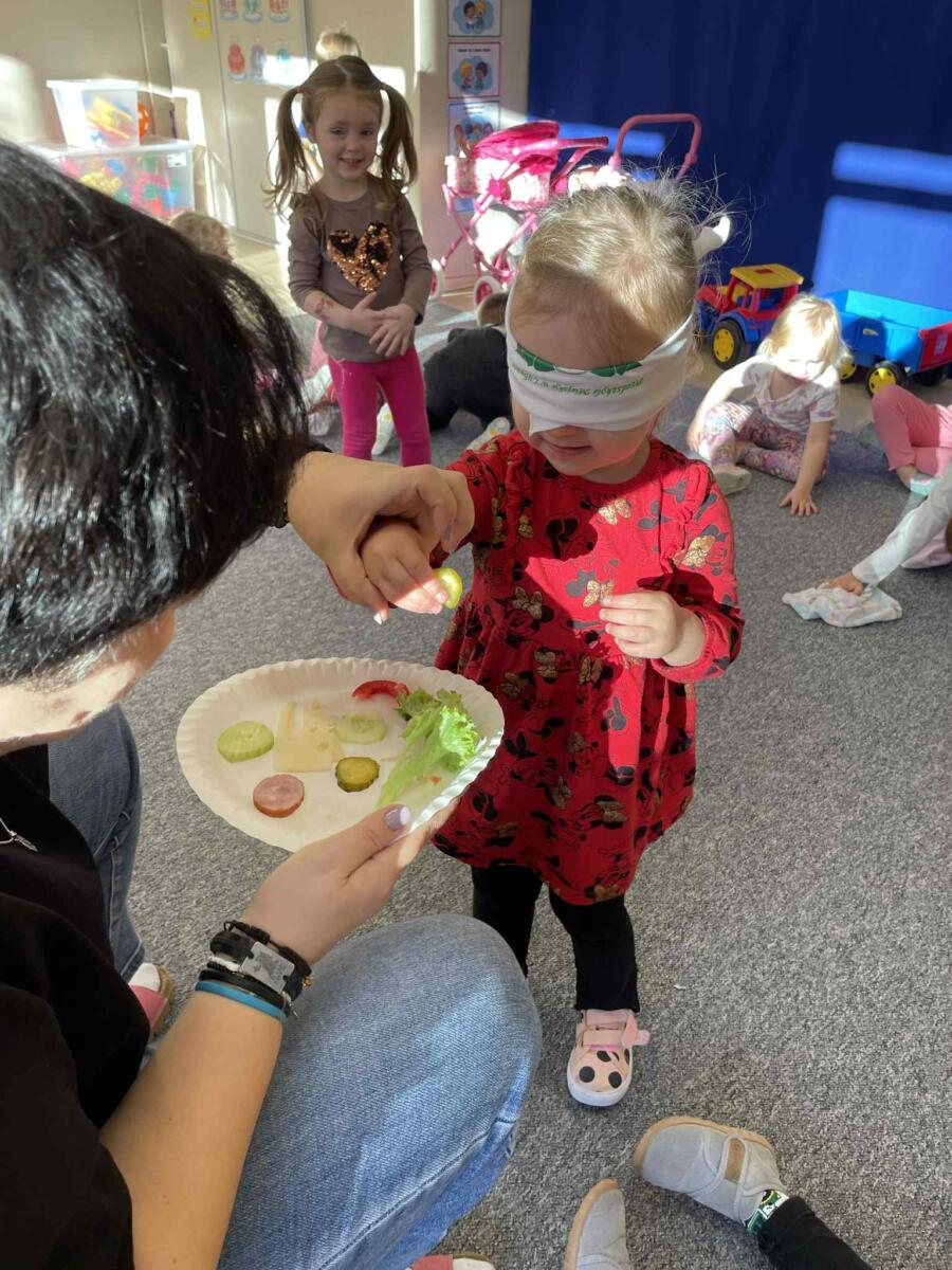 Na zdjeciu widzimy dziecko, które ma przepaskę na oczach. Jej zadaniem jest posmakować warzywo i po smaku powiedzieć jakie to warzywo..