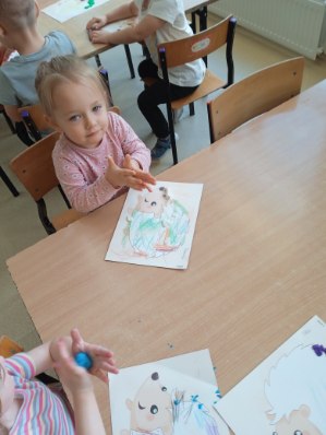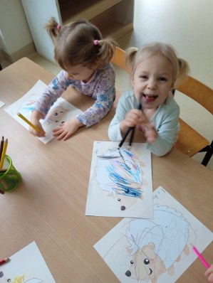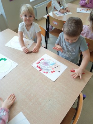 Dzieci ozdabiają jeża kolcami z plasteliny.
